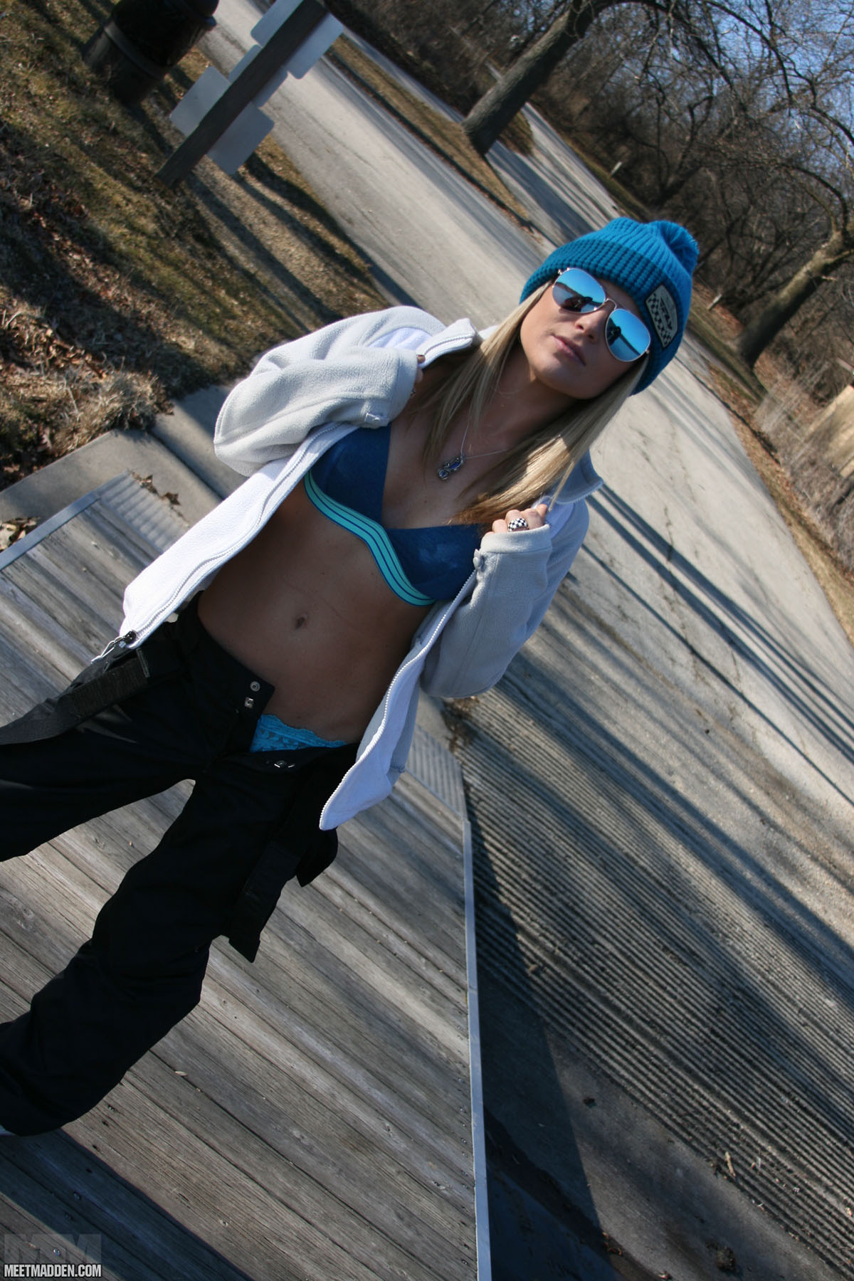 Madden is a busty blonde hottie who loves having fun. Despite the cold weather, she likes going out and flashes her butt outdoors. I love how she puts on a bikini and sunglasses like it's summer, while wearing a sweater and a beanie.