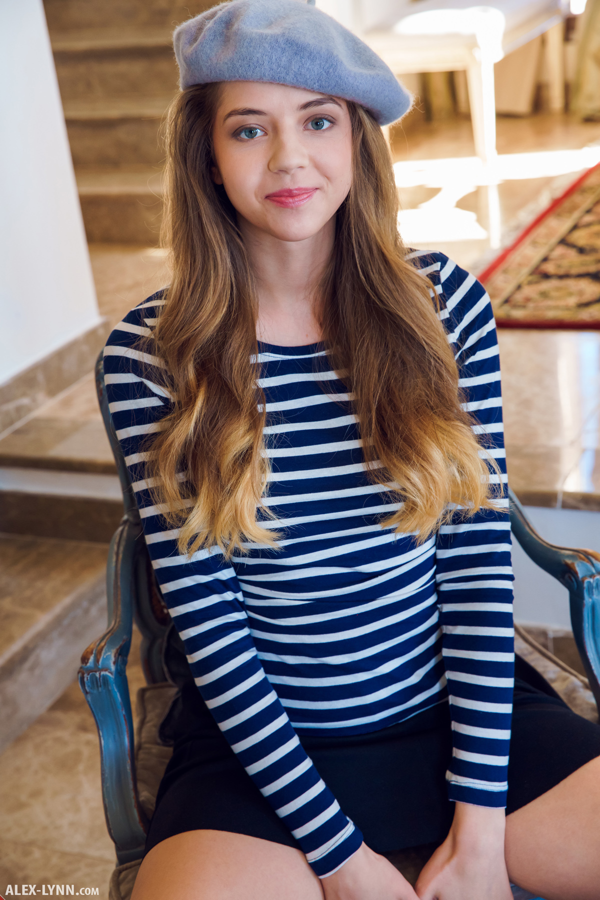 Lovely little Kay J returns to enchant us with her adorable smile and sassy personality. She's the perfect next door girl, cute and innocent. Her blue eyes are perfect with a french hat and those blue stripes, like a sexy sailor girl.