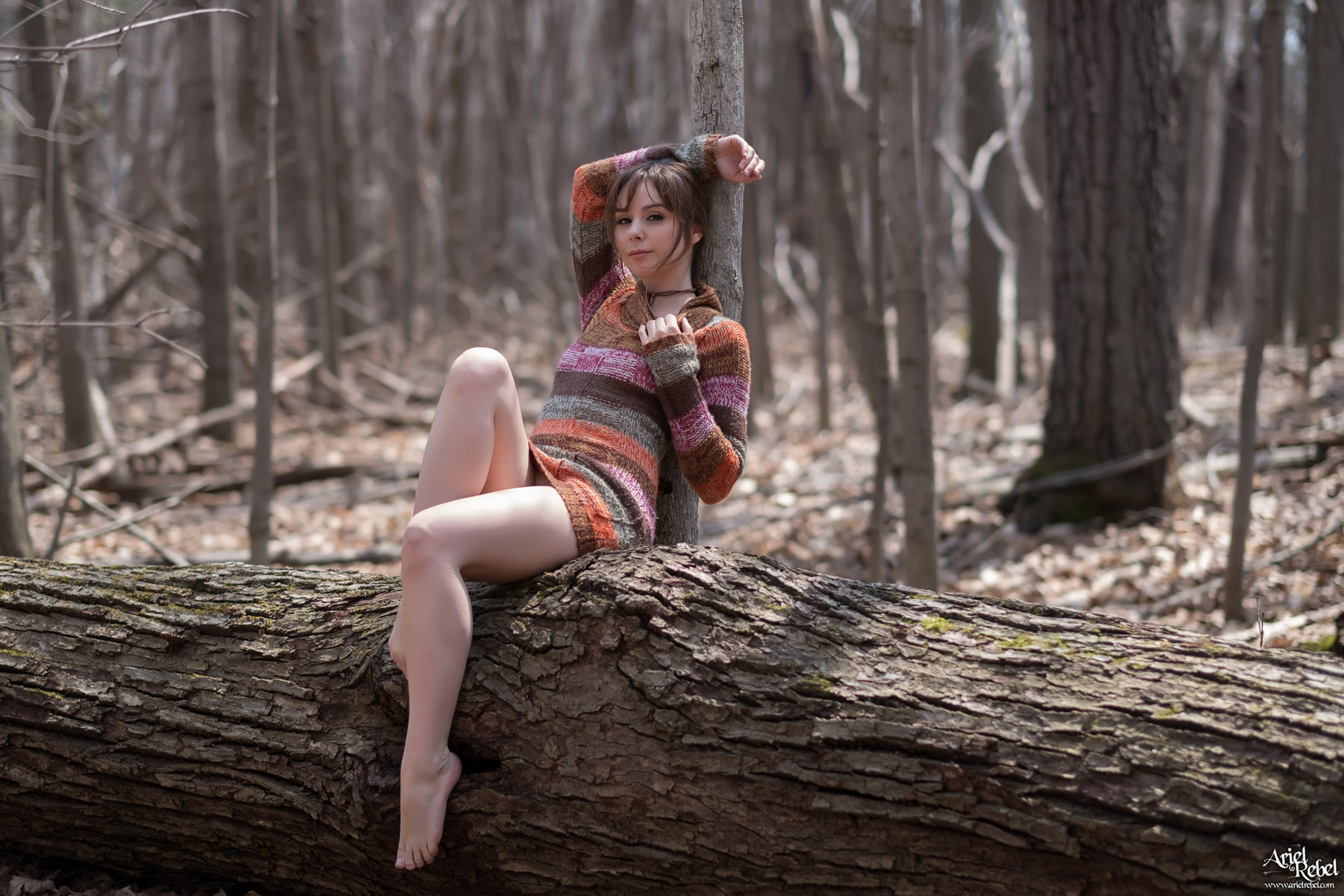 Young and sassy brunette Ariel Rebel loves long walks in the forest, wearing a cozy sweater with no panties on. At first she's always a little bit shy, but soon gets in the mood of spreading her cute legs wide open for a perfect view.
