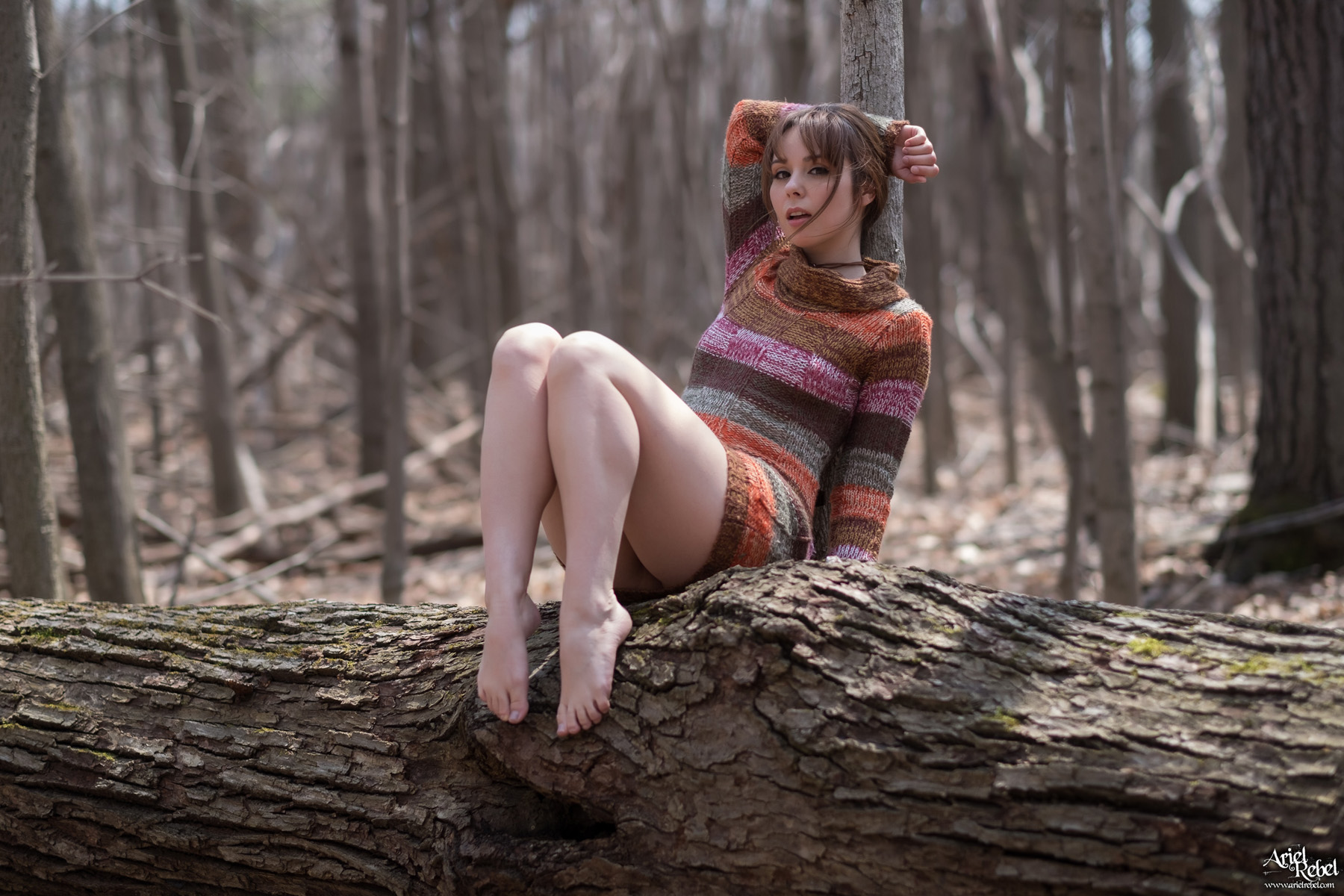 Young and sassy brunette Ariel Rebel loves long walks in the forest, wearing a cozy sweater with no panties on. At first she's always a little bit shy, but soon gets in the mood of spreading her cute legs wide open for a perfect view.