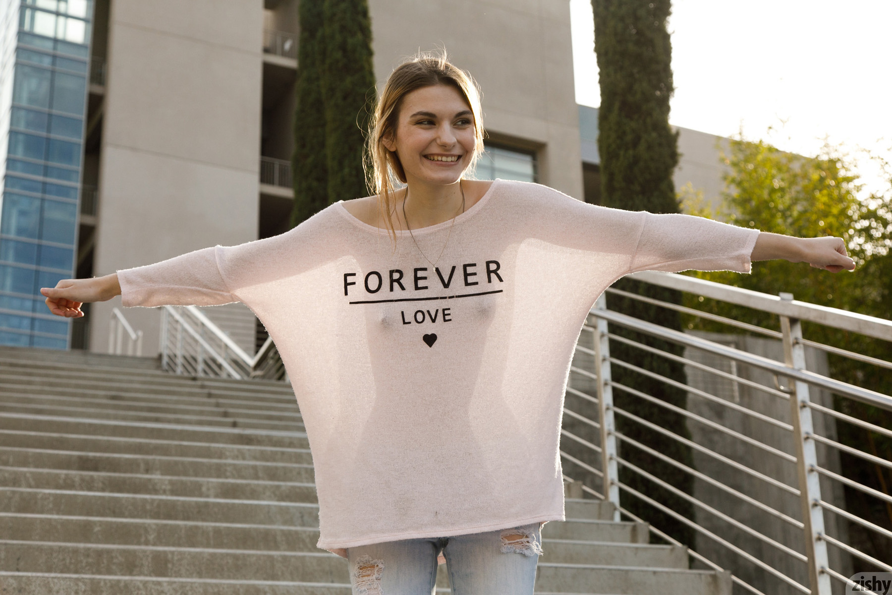 Young and lovely Lauralynn Parrish is on her first campus visitation, exploring the building, getting naked when nobody's around. I love her soft sweater without bra underneath, revealing the perfect shape of her breasts.