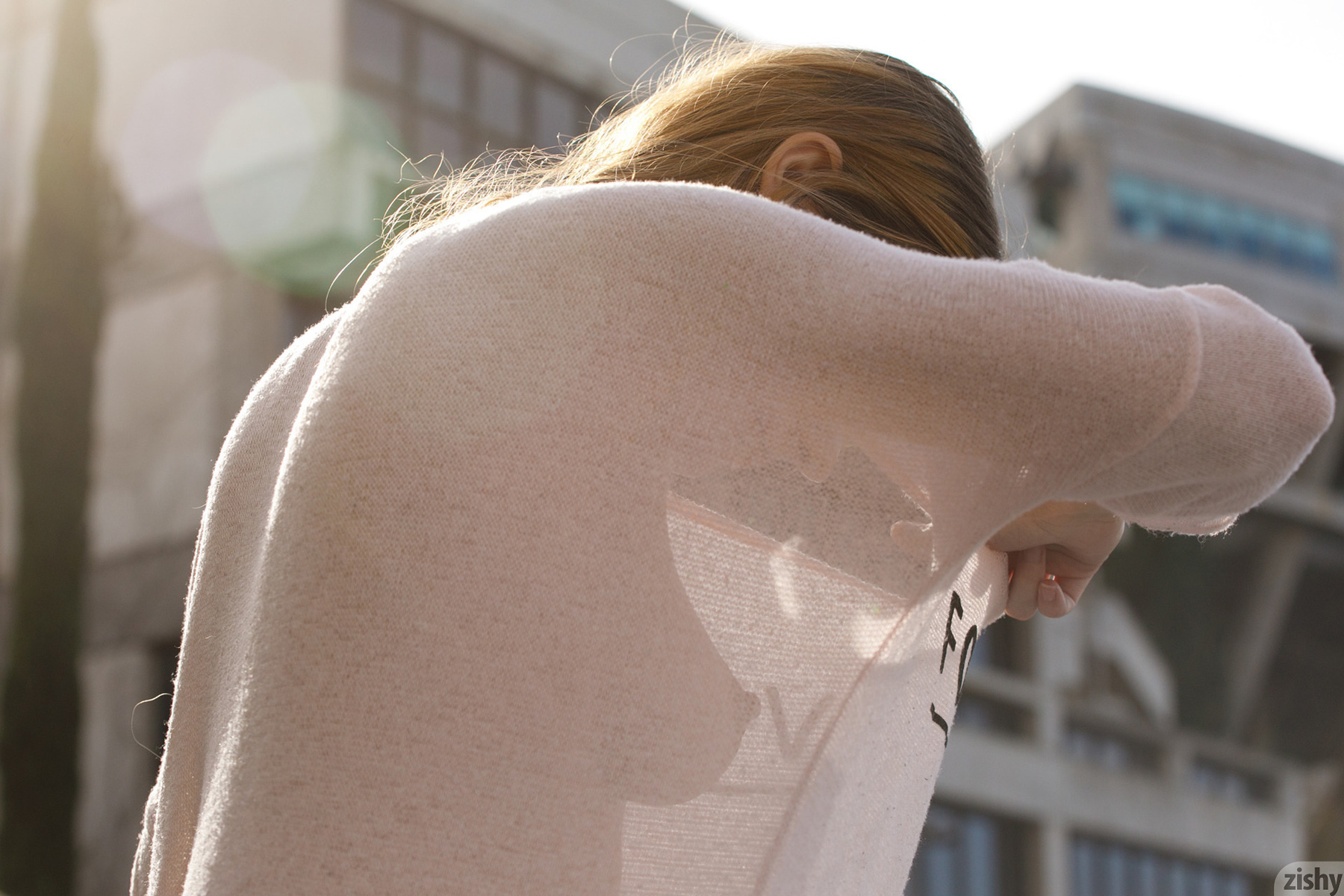 Young and lovely Lauralynn Parrish is on her first campus visitation, exploring the building, getting naked when nobody's around. I love her soft sweater without bra underneath, revealing the perfect shape of her breasts.